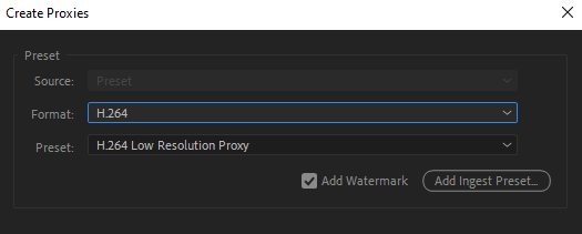 What’s a proxy? If you have a large video file/high quality video file it’s better to create a proxy file that the editor uses instead to improve the performance of using the editor. Premiere Pro has an inbuilt way of doing this, however the default proxy setting was a H.264 Low Resolution Proxy.